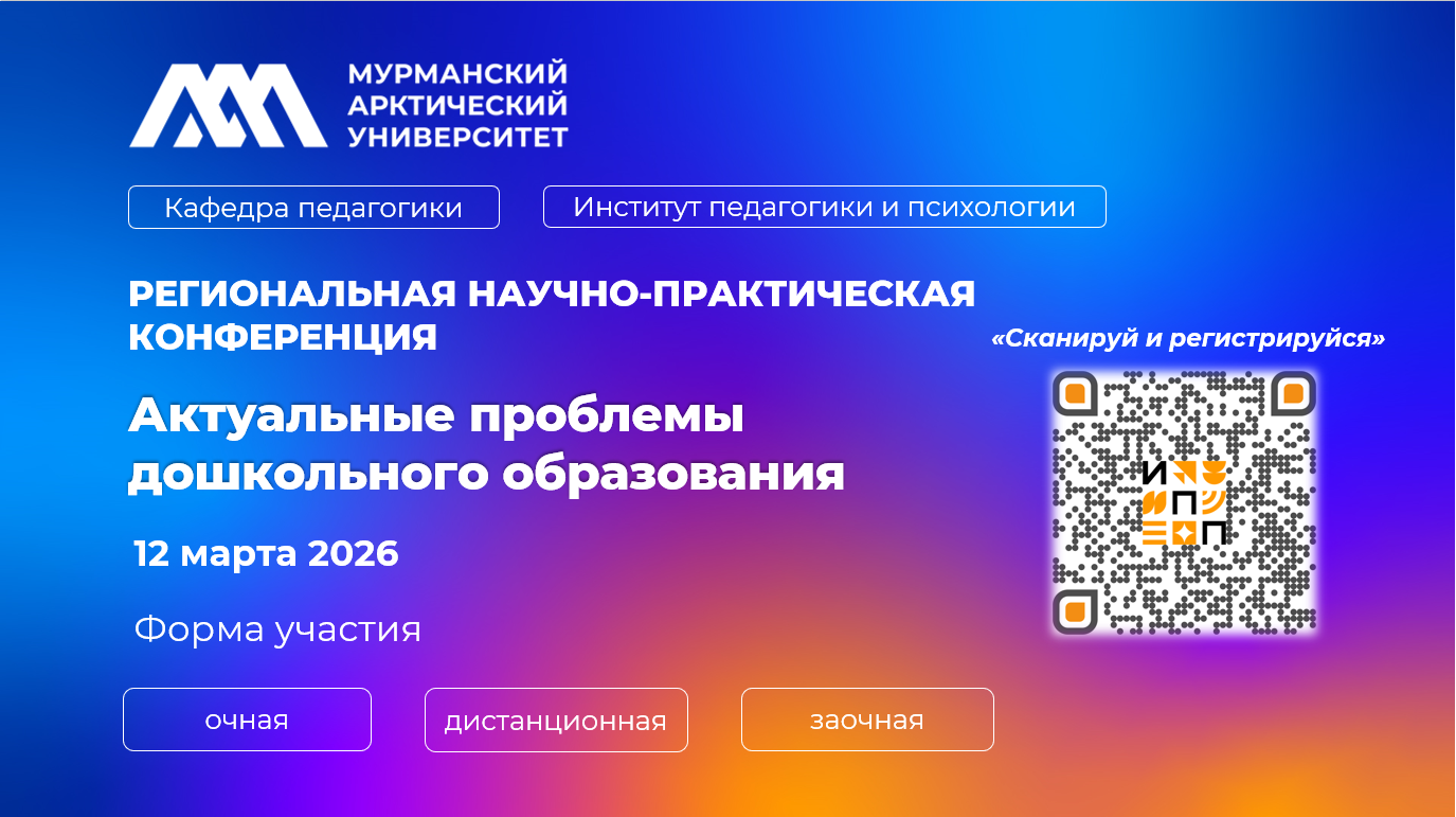 Кафедра педагогики Института педагогики и психологии МАУ приглашает студентов, аспирантов, преподавателей колледжей и вузов, а также педагогов дошкольных образовательных организаций Мурманской области принять участие в региональной научно-практической конференции. Обсудим актуальные вопросы развития дошкольного образования в условиях реализации ФГОС ДО и Федеральной образовательной программы дошкольного образования, а также обменяемся передовым педагогическим опытом.