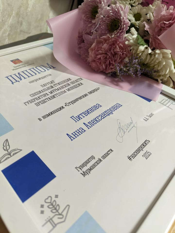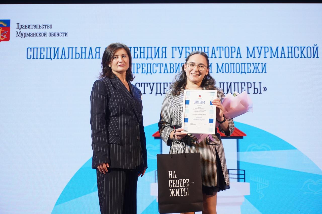 Наши активные студентки третьего курса направления подготовки Социальная работа и Организация работы с молодёжью Анна Литвинова (заместитель руководителя студенческого объединения «Волонтерский социальный отряд «СОЦИОНОМ») и Эвелина Ермакова (волонтер) были награждены Специальной стипендией губернатора Мурманской области в номинации «Студенческие лидеры».