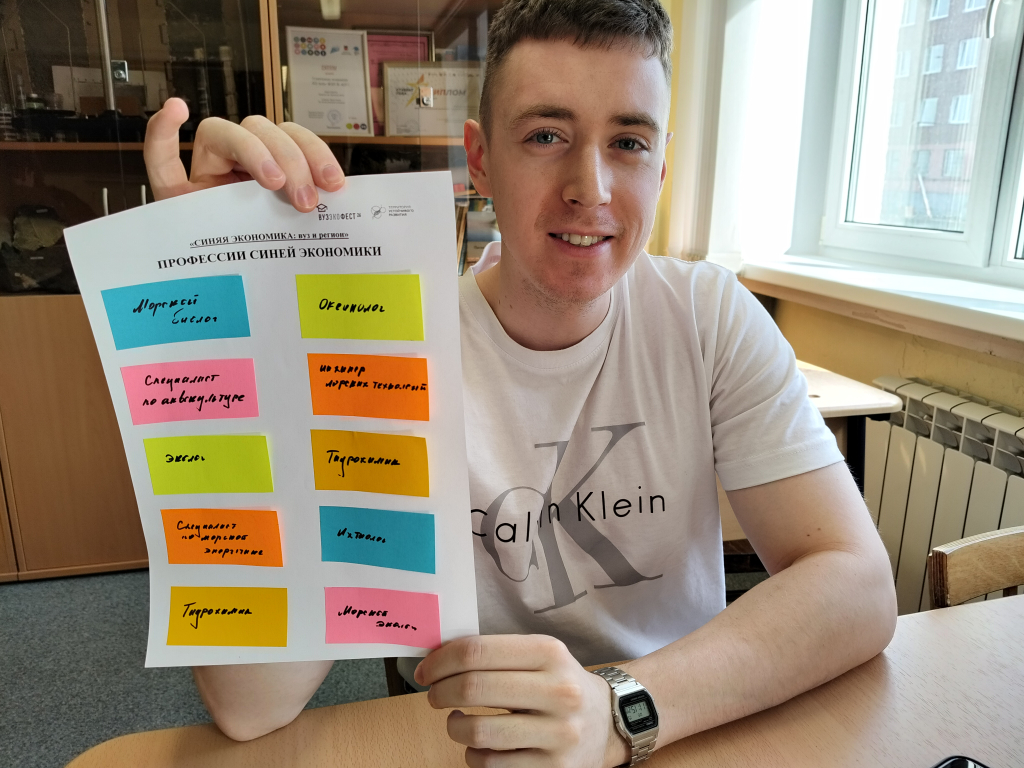 16 апреля студенты выполнили практическое задание «Профессии синей экономики»: изучили основные профессии «синей экономики», их востребованность в регионе, выделили требования к ним и основные навыки, а также подготовили тематический плакат, где все желающие могли вписать те профессии, которые им понравились. Это задание принесло нашей команде 20 баллов.
