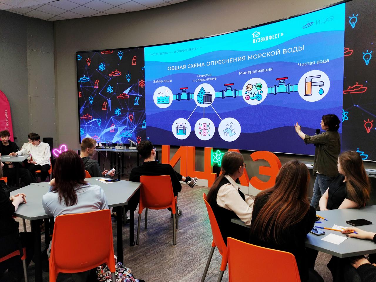 В этот же день гости фестиваля (студенты МАУ и школьники из гимназии № 6 г. Мурманска) собрались на площадке атомного ледокола «Ленин» на интерактивном занятии «Чистая вода и опреснение» с нашими партнерами — командой ИЦАЭ г. Мурманска, чтобы обсудить проблему чистой воды. Ребята узнали о роли воды в организме и жизни человека, изучили, где и на какие нужды человеком расходуется вода, в видеосюжете увидели основные этапы процесса опреснения воды. Самым потрясающим была экспериментальная работа с макетами опреснительных установок: ребята самостоятельно преодолели весь цикл от соленой до пресной воды, увидели работу разных опреснительных установок в действии, узнали о принципах их работы. Много новых фактов, активная командная работа и дружеская атмосфера ИЦАЭ — всё это было в этот день у нас на фестивале!