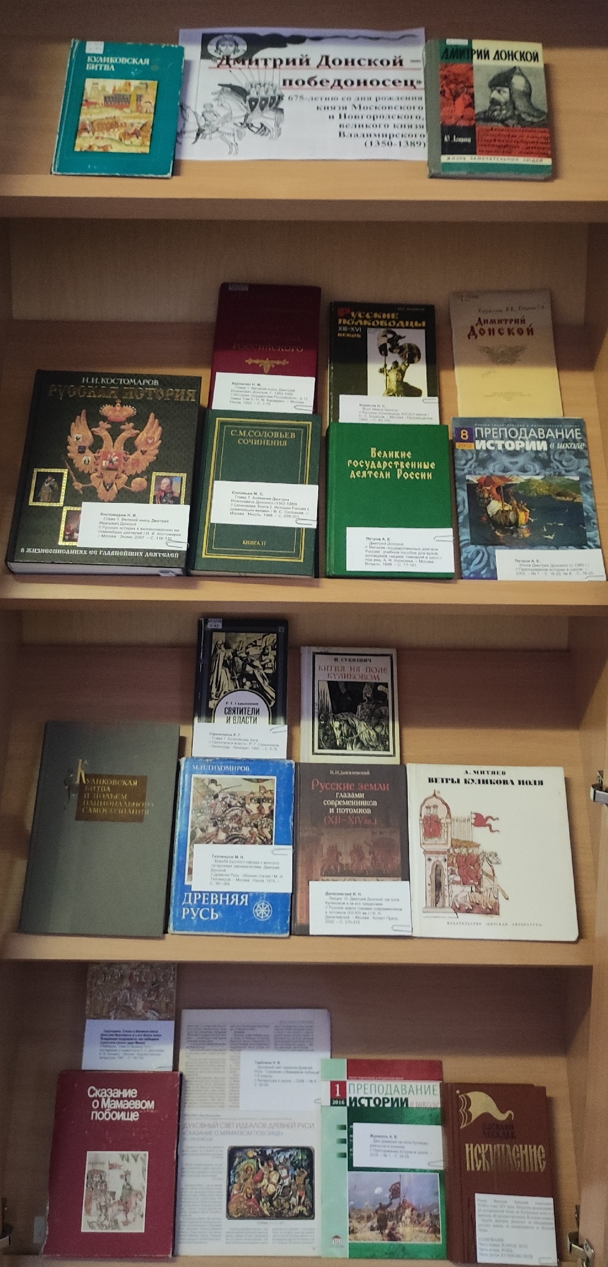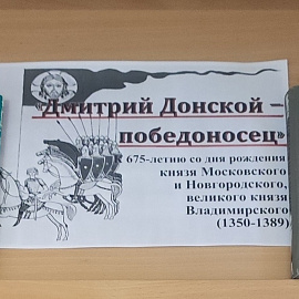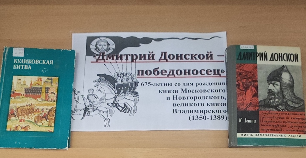 К этой знаменательной дате библиотека МАУ подготовила книжно-журнальную выставку «Дмитрий Донской — победоносец. К 675-летию со дня рождения князя Московского и Новгородского, великого князя Владимирского (1350−1389)».