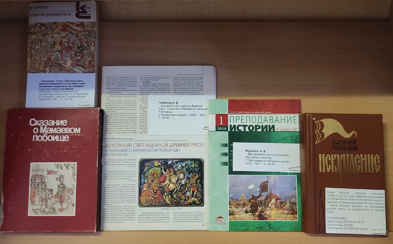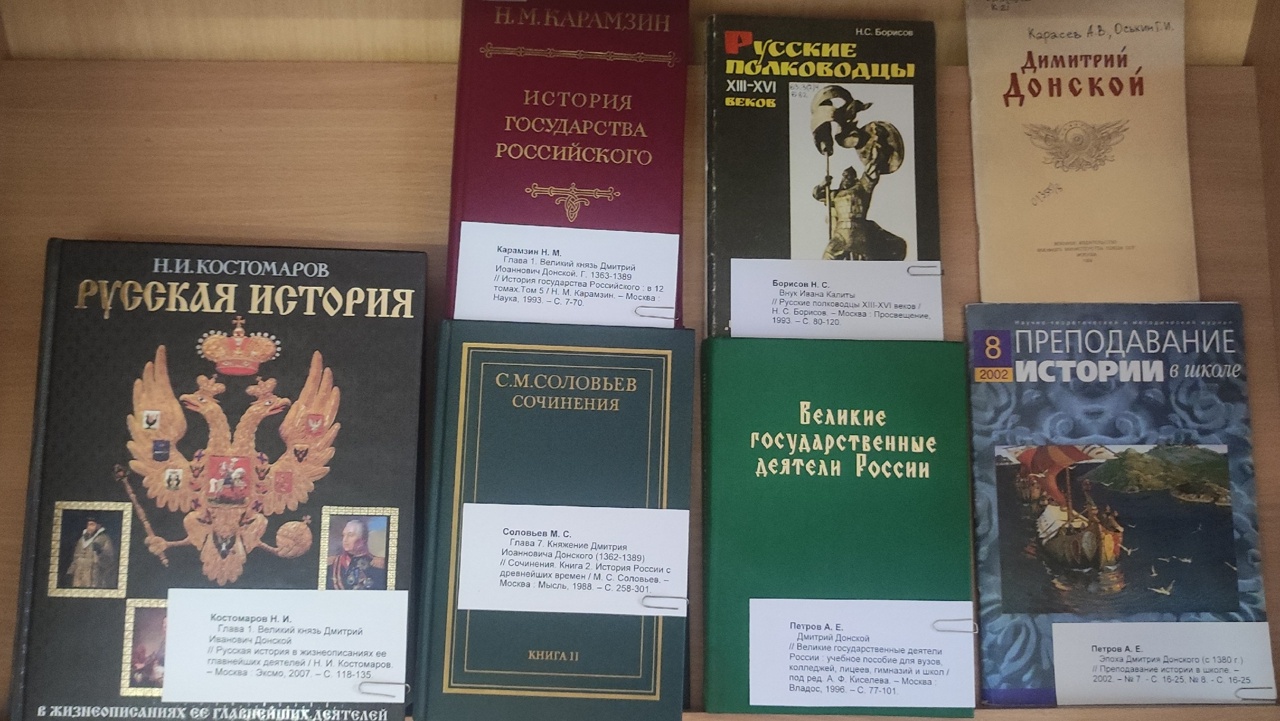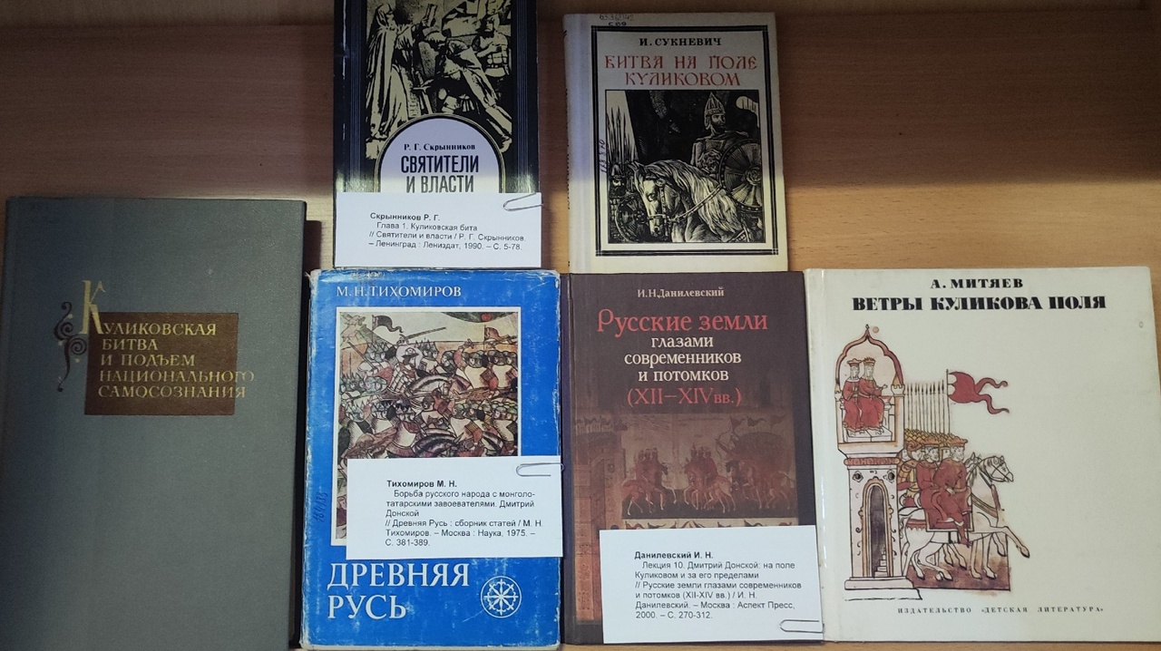 На ней представлены книги, исторические материалы, журнальные статьи об истории Руси, о великом князе Дмитрии Донском, о знаменитой Куликовской битве, о рождении объединенной Московской Руси.