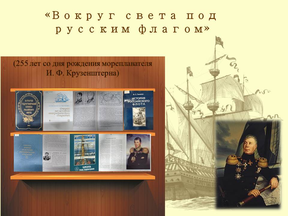 Общий абонемент (207 В) представляет книжную выставку «„Вокруг света под русским флагом“: 255 лет со дня рождения мореплавателя И.Ф. Крузенштерна»
