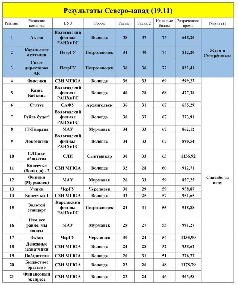 Всего по Северо-Западному Федеральному округу в финале участвовала 21 команда. От МАУ участие в ФинИгре принимали три команды: