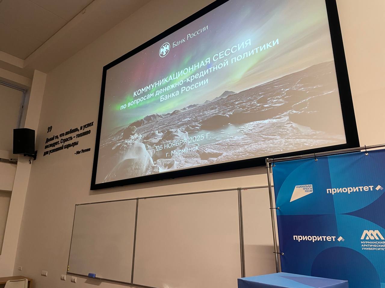 В Мурманске 25−26 ноября 2025 г. прошла коммуникационная сессия Банка России по вопросам денежно-кредитной политики. В ходе нее на площадке Мурманского Арктического университета (МАУ) представители регулятора встретились с академическим сообществом — студентами и педагогами средних профессиональных и высших учебных заведений. К открытому диалогу присоединилось более 200 участников со всего региона.
