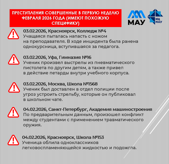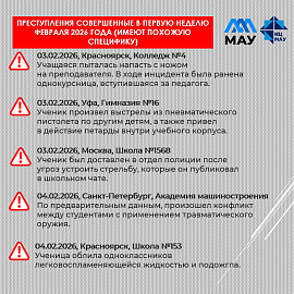 · 03.02.2026, Уфа, Гимназия № 16: Ученик произвёл выстрелы из пневматического пистолета по другим детям, а также привёл в действие петарды внутри учебного корпуса.
