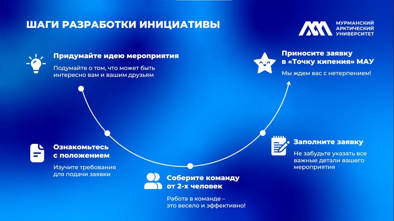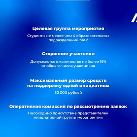 Студенческая инициатива — это мероприятие или проект, направленный на вовлечение обучающихся в коллективную внеучебную деятельность, объединение университетского сообщества или улучшение инфраструктуры МАУ.