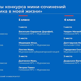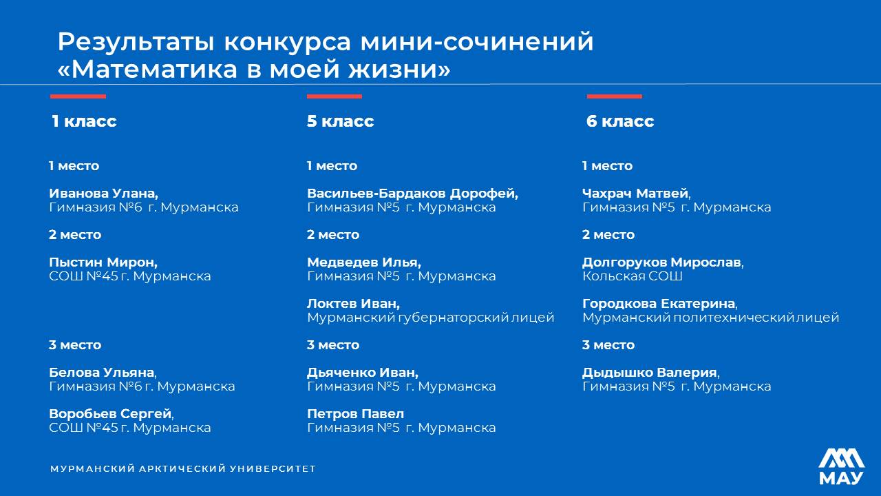 Кроме того, самые младшие участники фестиваля — ученики 1−6-х классов — написали мини-сочинения на тему «Математика в моей жизни». Из сочинений мы узнали, что мы чистим зубы 36 часов в год; применение математических вычислений в плавании помогает достичь лучших результатов; танцы будут ритмичными, если умеешь считать без ошибок; математика нужна для управления самолетом; ежемесячное планирование бюджета поможет откладывать средства на что-то приятное. Кафедра высшей математики и физики МАУ выражает благодарность учителям гимназий № 5 и № 6, Мурманского политехнического лицея, Мурманского академического лицея, Мурманского губернаторского лицея, а также учителям Туломской и Кольской СОШ за участие в конкурсе сочинений.