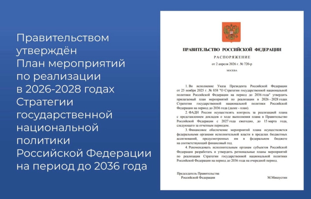 Правительством утвержден План мероприятий по реализации Стратегии государственной национальной политики. Институт гражданской идентичности представляет ключевые направления работы на 2026−2028 годы.