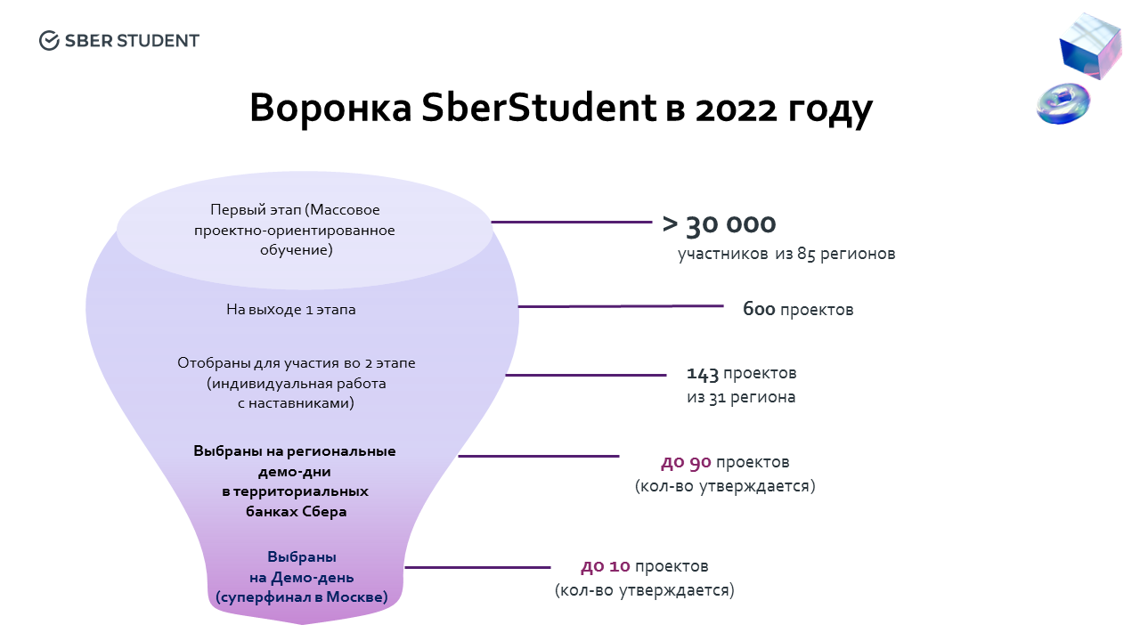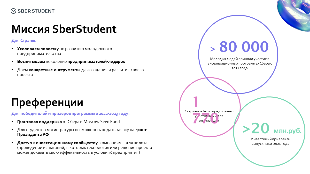В целях реализации Федерального проекта и в интересах развития технологического предпринимательства в стране с 2021 года Сбер реализует федеральную инициативу SberStudent (https://sberstudent.sberclass.ru) — акселератор технологических стартапов для студентов, аспирантов и научных сотрудников.