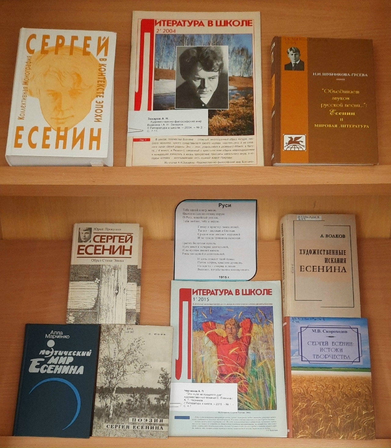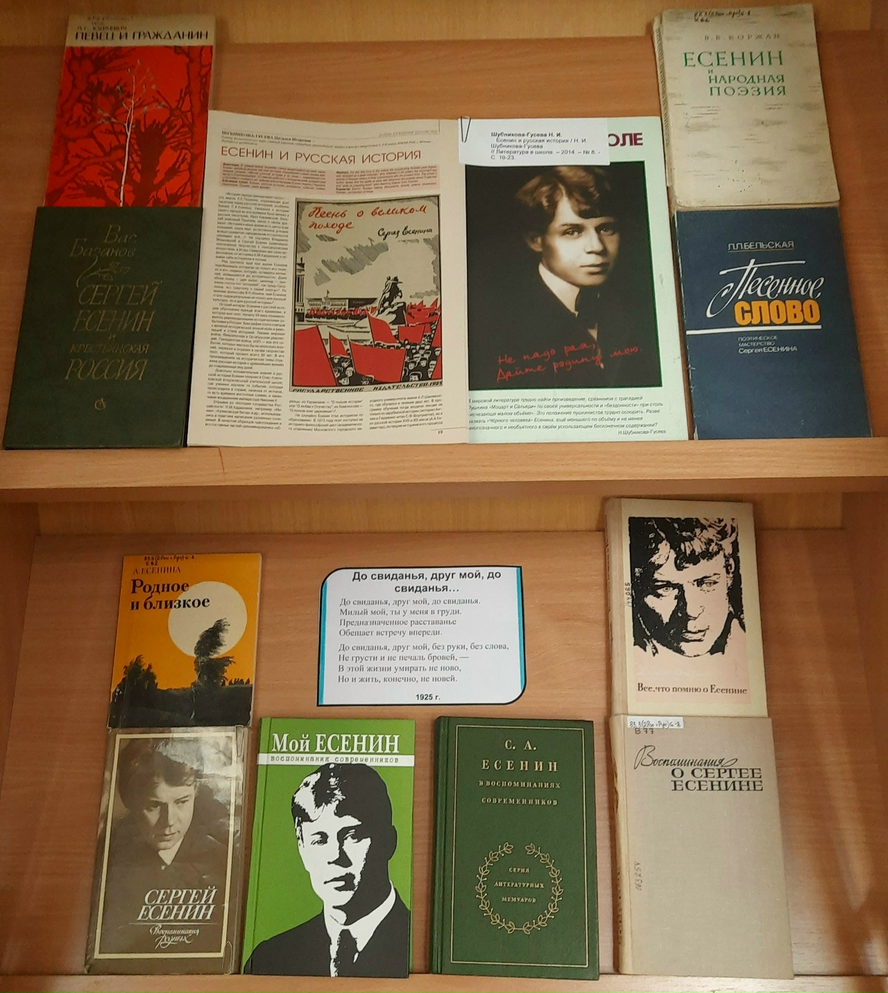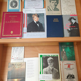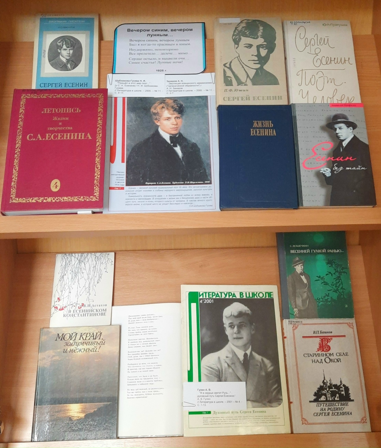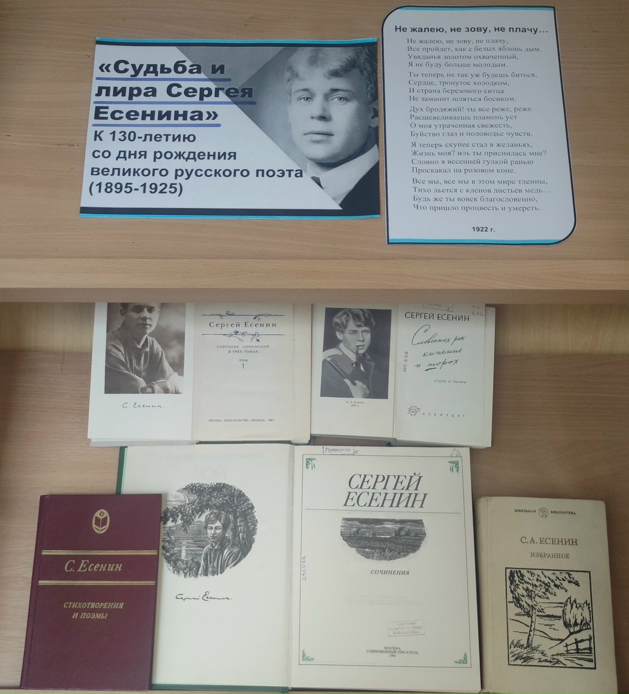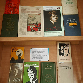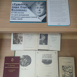В честь юбилея великого русского поэта абонемент библиотеки подготовил книжно-журнальную выставку «Судьба и лира Сергея Есенина. К 130-летию со дня рождения великого русского поэта».