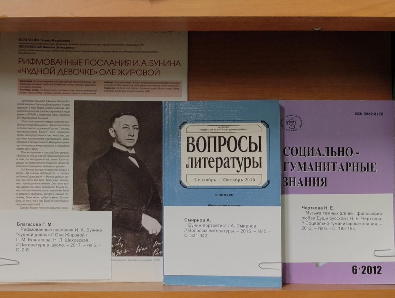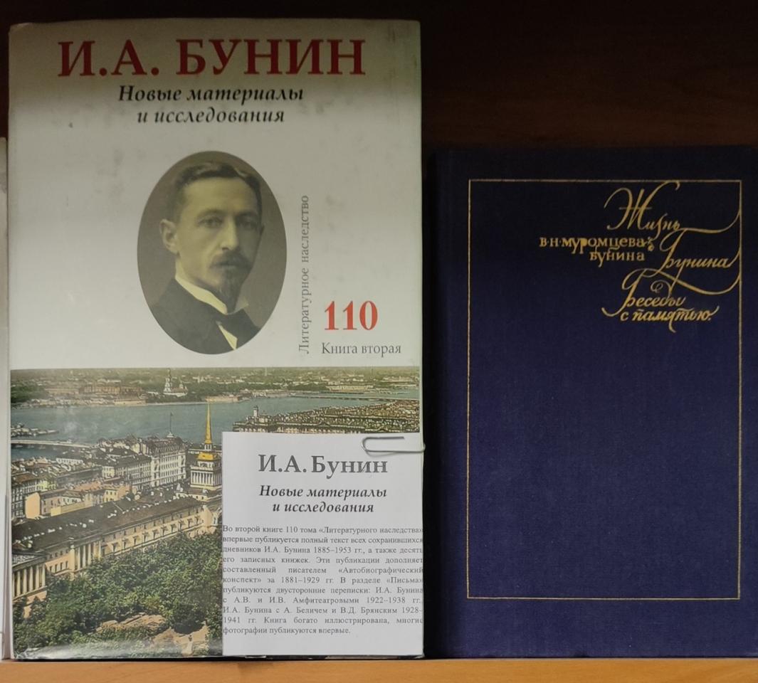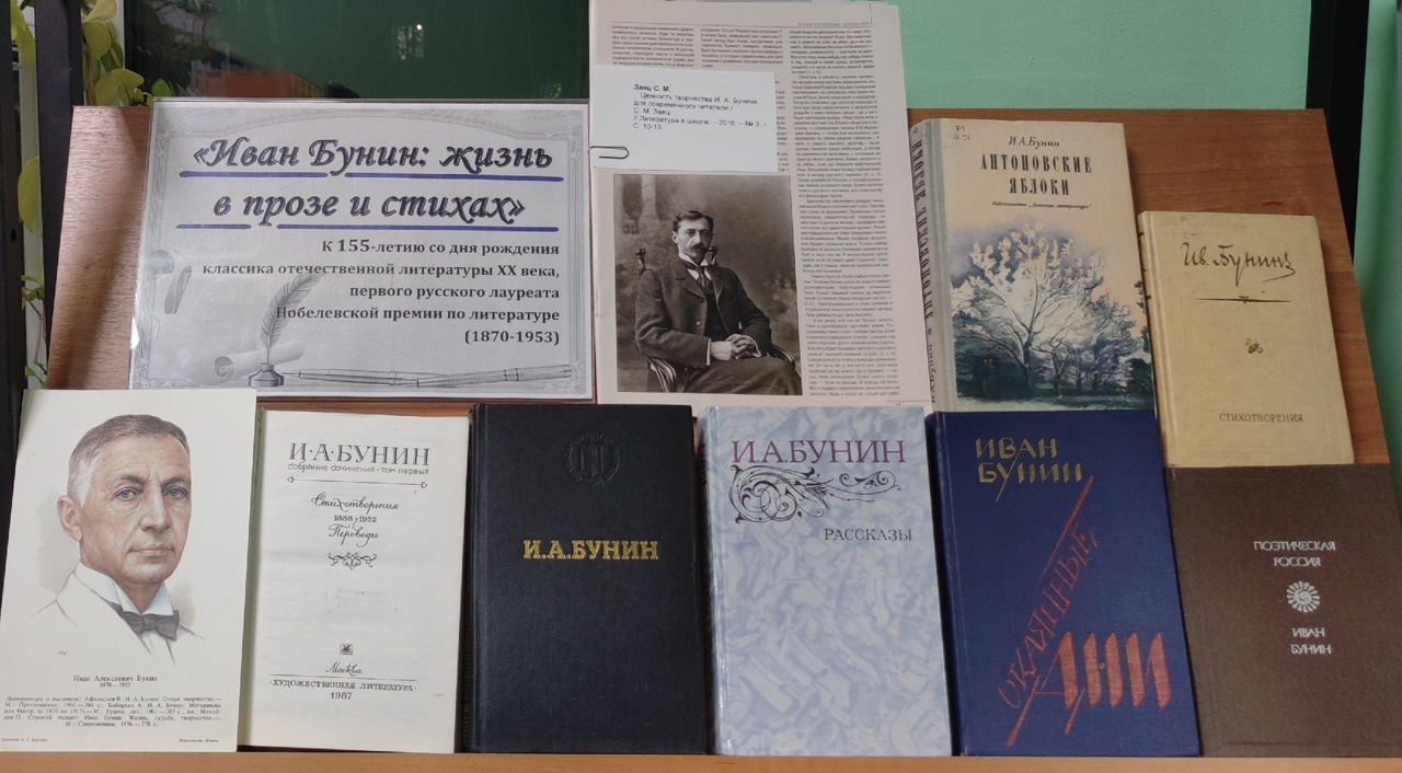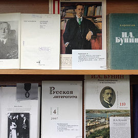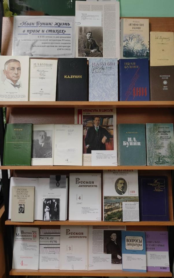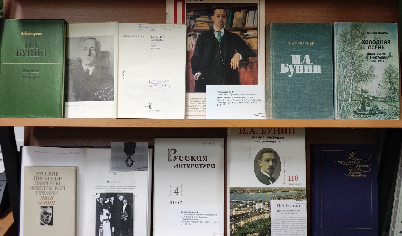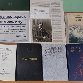 В честь юбилея русского писателя в библиотеке открылась книжная выставка «Иван Бунин: жизнь в прозе и стихах», на которой представлены произведения, созданные автором в разные годы, а так же литература о жизни и творчестве Ивана Бунина, дневники писателя, воспоминания жены.