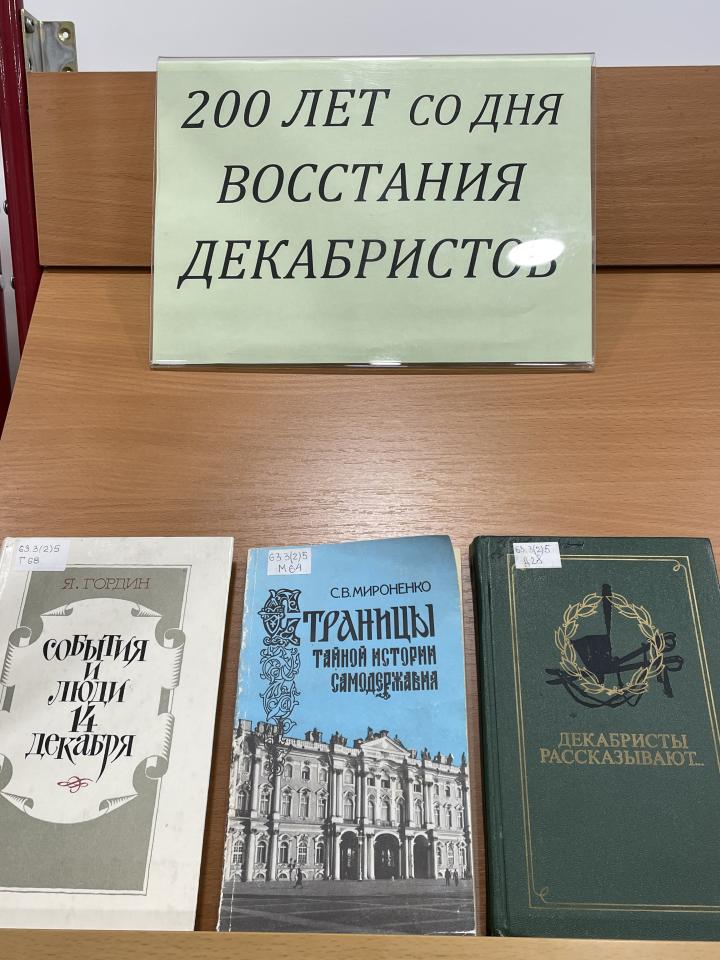 На выставке представлены книги и журналы из фонда библиотеки об истории декабристского движения, предпосылках развития, политической и общественной обстановке того времени, о последствиях однодневного восстания, растянувшихся на долгие десятилетия. Восстание декабристов в декабре 1825 года до сих пор волнует умы историков и находит отражение в многочисленных произведениях научной, публицистической и художественной литературы.