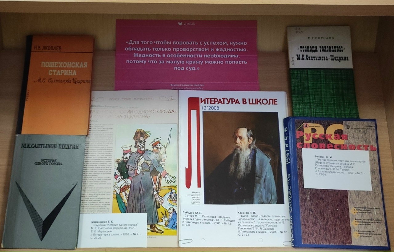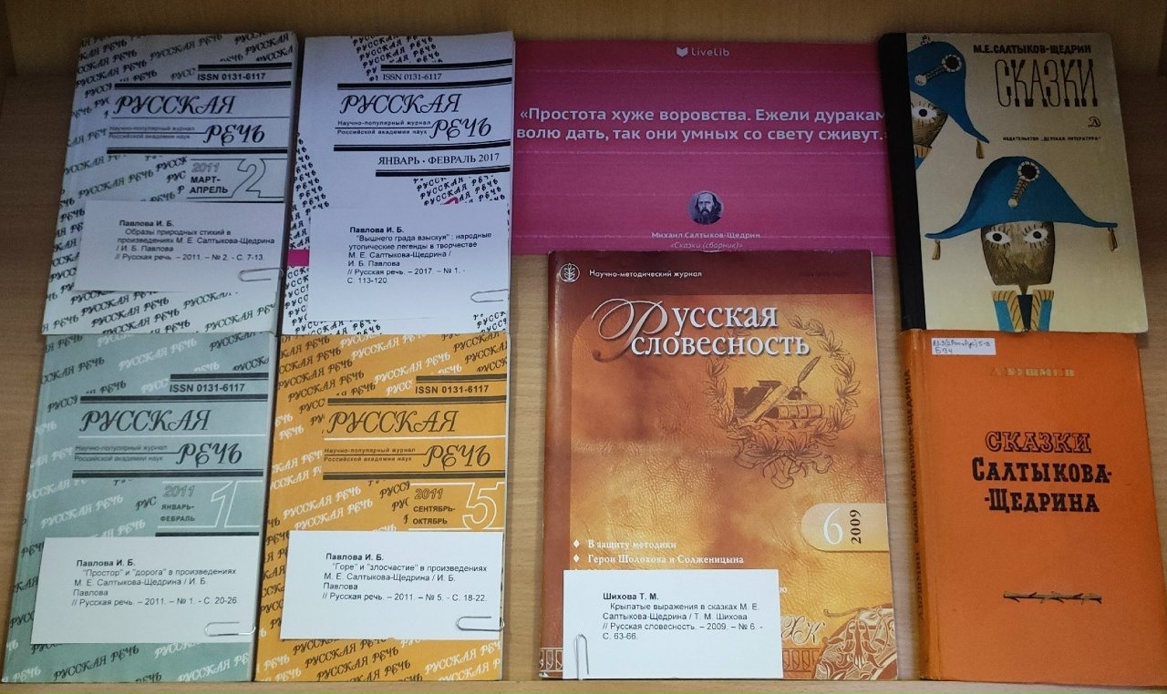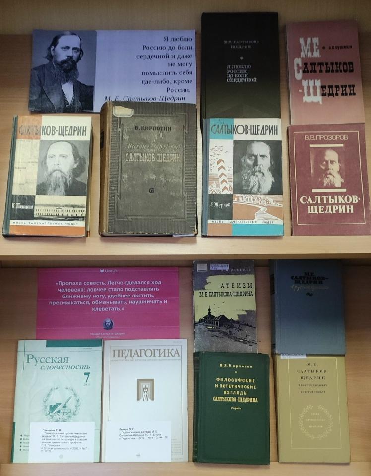 На выставке представлены избранные произведения мастера: «История одного города», «Господа Головлевы», «Пошехонская старина», «Помпадуры и помпадурши», «Благонамеренные речи», сборники сказок и рассказов. А также обширная биографическая литература, научные исследования творчества Салтыкова-Щедрина, критическая литература.