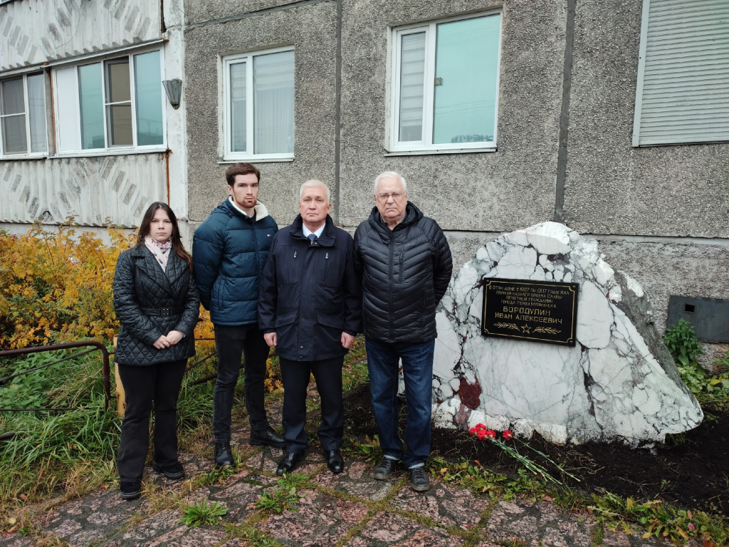 С гордостью сообщаем, что студенты Алферова Виктория и Катенкарий Олег вместе с депутатом областной думы Михаилом Белошеевым и почетным жителем города Мурманска Владимиром Горячкиным приняли участие в возложении цветов к мемориальной доске, установленной в честь Ивана Алексеевича Бородулина — ветерана Великой Отечественной войны, полного кавалера Ордена Славы. Эта важная акция напомнила всем о значимости исторической памяти и уважении к нашим героям.