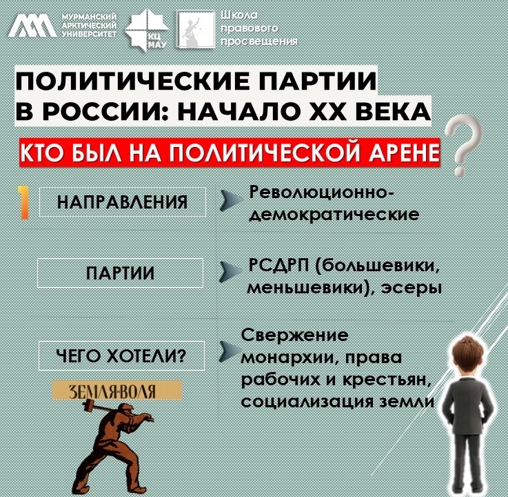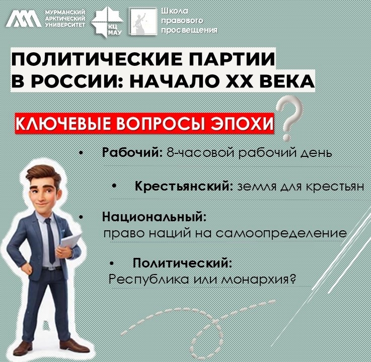 · Ключевые вопросы эпохи: 8‑часовой рабочий день, земля, самоопределение народов, форма правления (монархия или республика).
