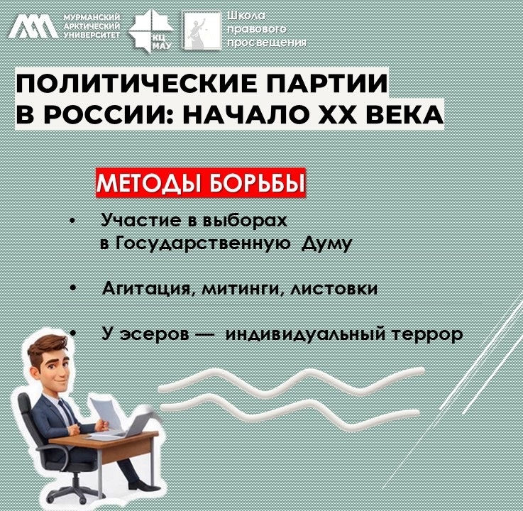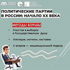· Методы борьбы: участие в выборах в Государственную Думу, агитация, митинги, листовки (у радикалов — индивидуальный террор).