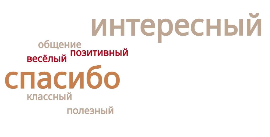 Чтобы зафиксировать впечатления студентов, была создана визуализация отзывов в форме облака слов, отражающего главные идеи и чувства, возникшие у ребят после участия в тренинге.