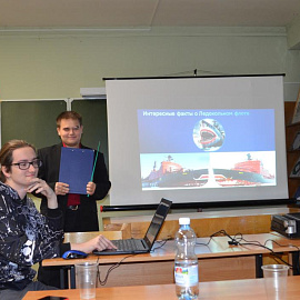 Студенты Морской академии направления подготовки «Кораблестроение, океанотехника и системотехника объектов морской инфраструктуры» Степан Волков и Данила Акентьев рассказали много интересных фактов из истории ледокольного флота, а Александр Шломин представил доклад на тему «Анализ докового производство в порту Мурманск».